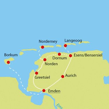 Easy - East Frisia and the islands are ideal areas for cycling. All routes are mostly flat! Cycling is mostly on tarmac or paved farm tracks, occasionally on small side roads. The routes are particularly suitable for beginners and cycle groups. All ferry crossings including the bike are included!